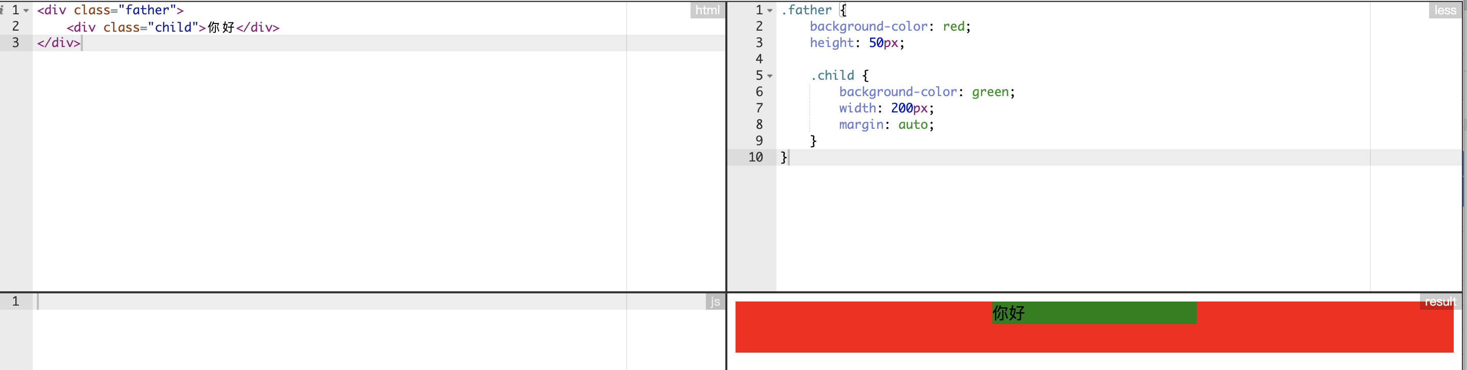 .father { background-color: red; height: 50px; .child { background-color: green; width: 200px; margin: auto; } }