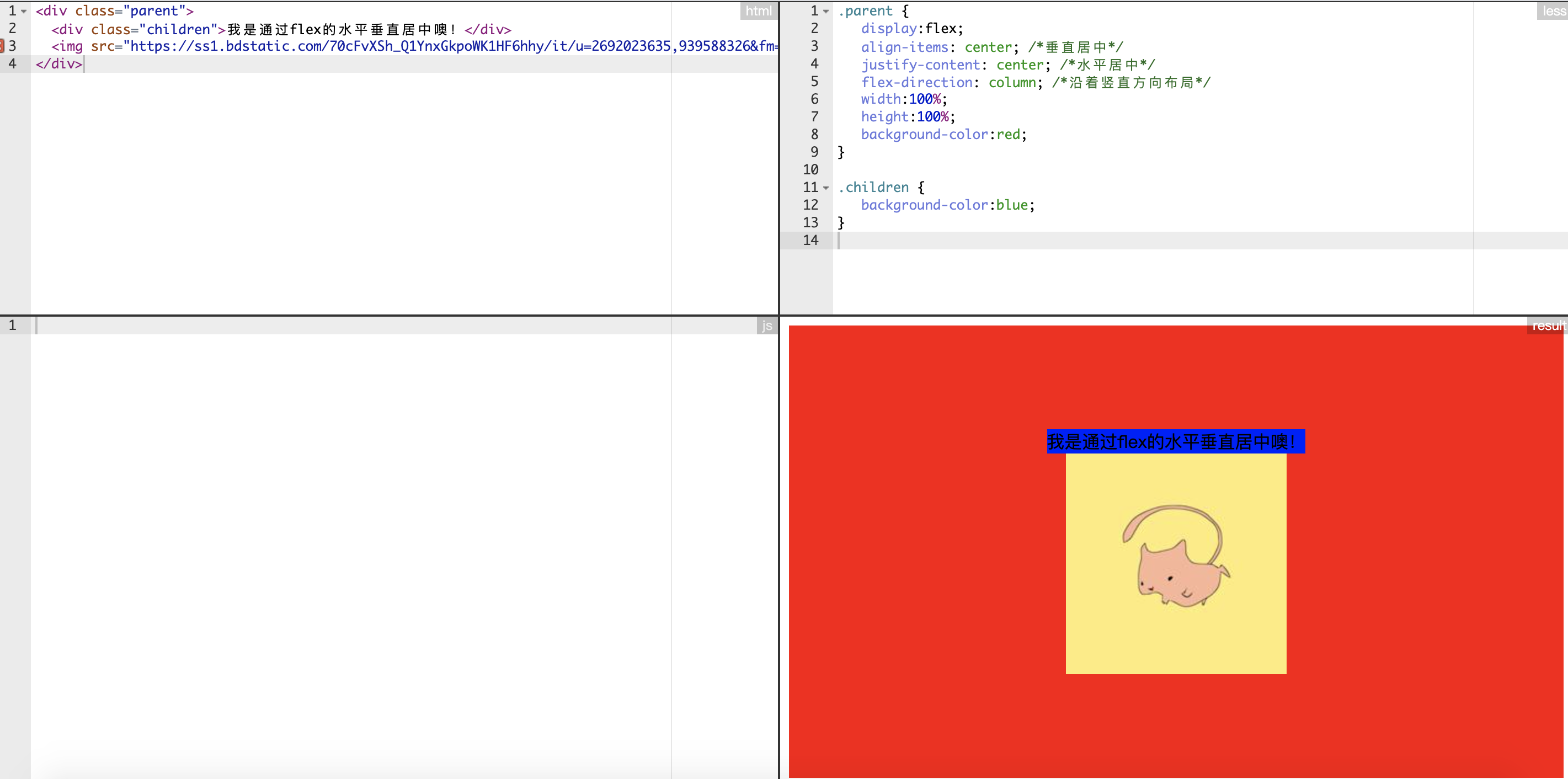 | <div class="parent"> <div class="children">我是通过flex的水平垂直居中噢!</div> <img src="https://ss1.bdstatic.com/70cFvXSh_Q1YnxGkpoWK1HF6hhy/it/u=2692023635,939588326&fm=26&gp=0.jpg" /> </div>