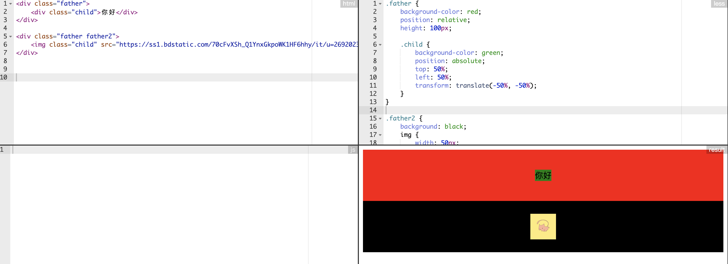<div class="father father2"> <img class="child" src="https://ss1.bdstatic.com/70cFvXSh_Q1YnxGkpoWK1HF6hhy/it/u=2692023635,939588326&fm=26&gp=0.jpg" /> </div>