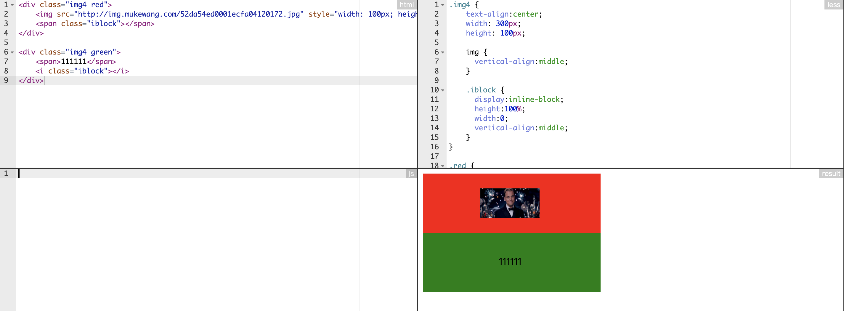 | <div class="img4 red"> <img src="http://img.mukewang.com/52da54ed0001ecfa04120172.jpg" style="width: 100px; height: 50px" /> <span class="iblock"></span> </div>